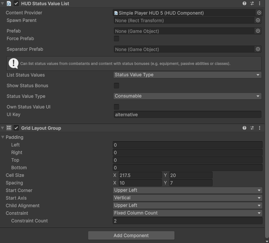 Then I created a variant of the player HUD which shows the "Status Value List" and in the "HUD Status Value List" component, I've defined the specific name of the UI key.